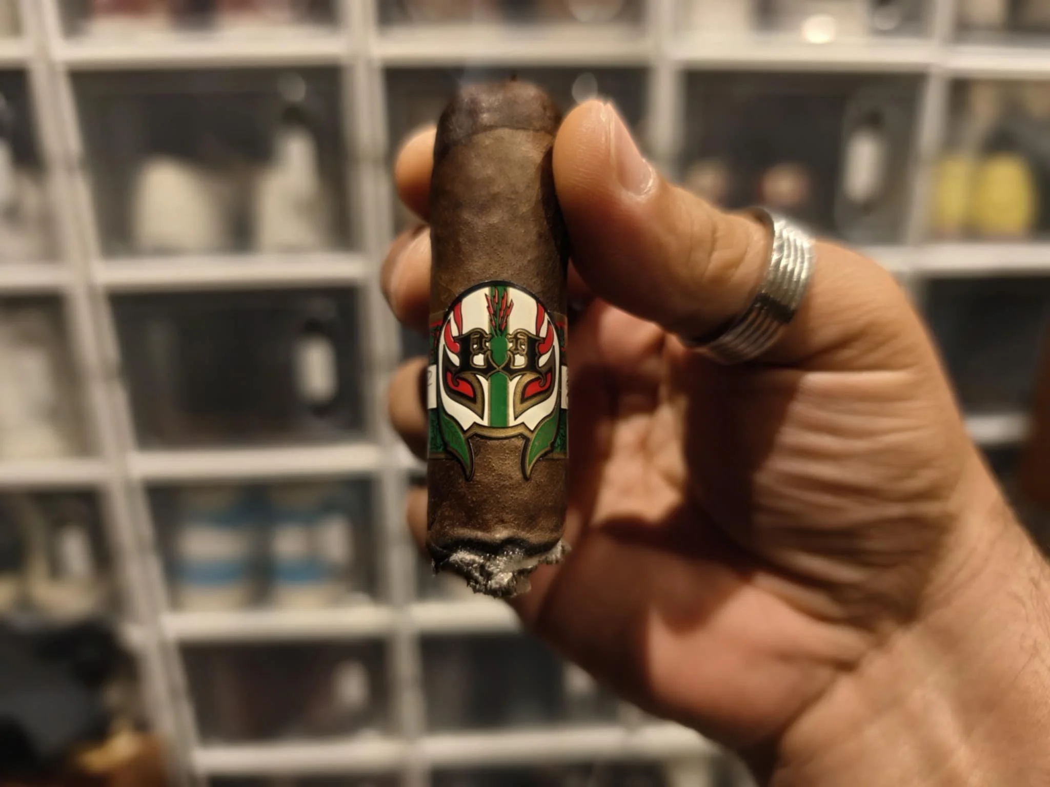 The Luchador Hombre shows off a dark, toothy Mexican San Andrรฉs wrapper that looks rugged and powerful. The roll feels firm and weighty in hand. Pre-light draw offers barnyard funk, cocoa, and a jab of pepperโclearly hinting this cigar isnโt here to play nice.